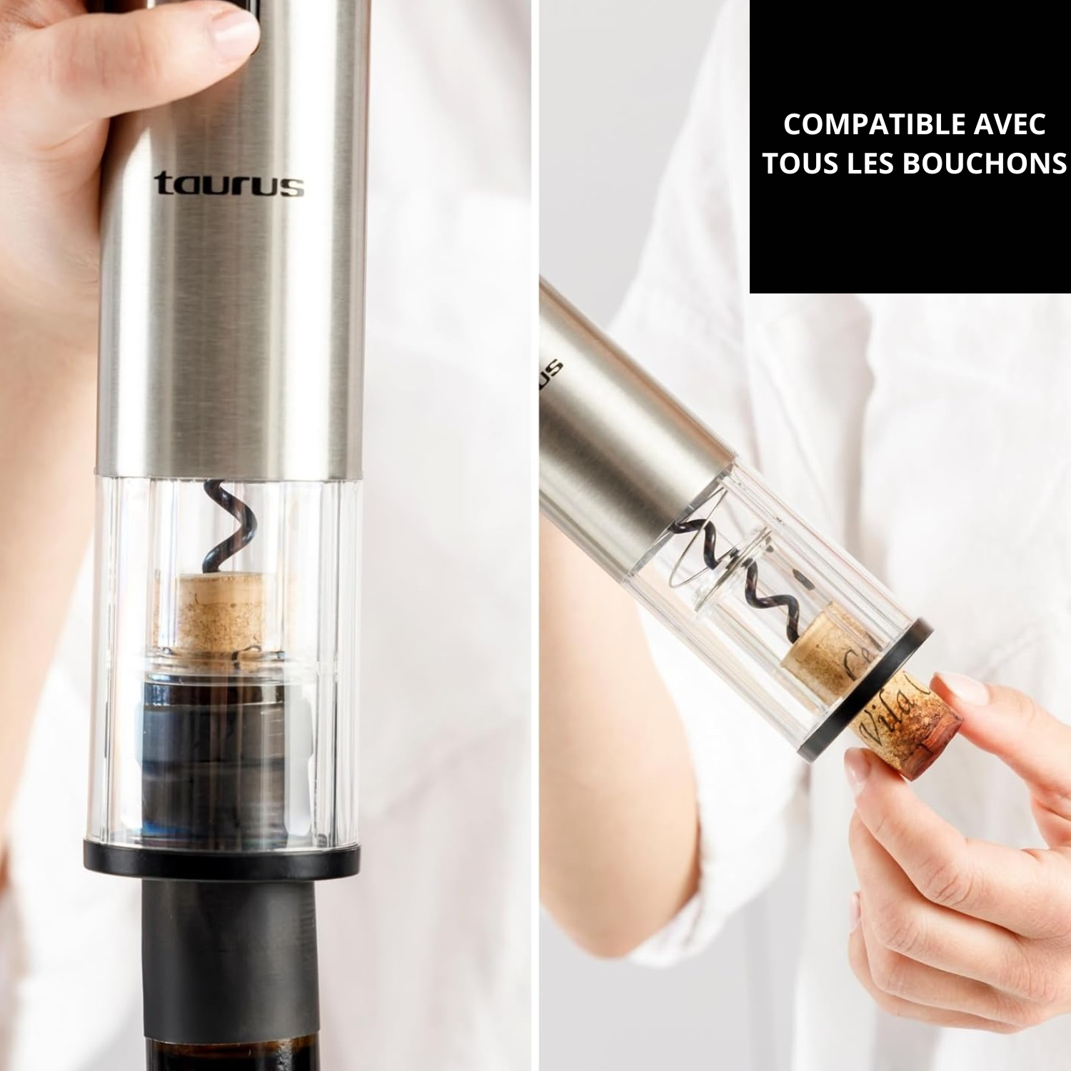 Le tire-bouchon fonctionne avec 4 piles AA (non fournies). Une seule charge permet d'ouvrir jusqu'à 80 bouteilles. Pratique, économique et toujours prêt à l'emploi !